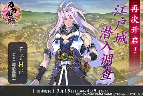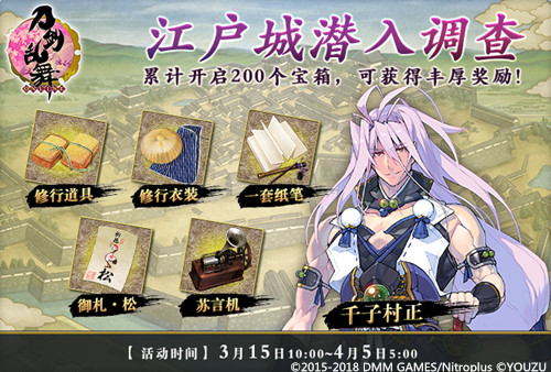 《刀剑乱舞-ONLINE-》江户城潜入调查活动即将开启,在活动期间内,审神者探索江户城,即有机会获得一定数量的钥匙,使用钥匙开启神秘宝箱,即有概率寻觅到藏身于宝箱中的刀剑男士——【打刀·千子村正】,除此之外,还有各种资源和极化道具等待审神者发现。