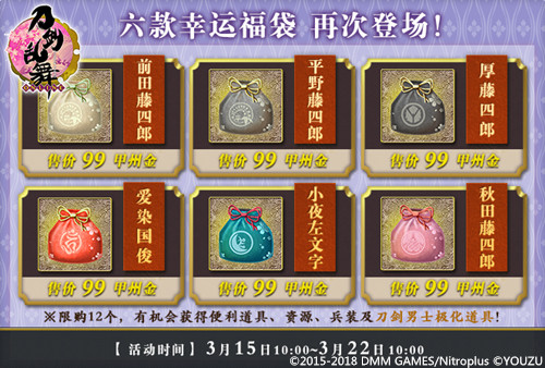《刀剑乱舞-ONLINE-》幸运福袋再次开启售卖,分别是前田藤四郎、平野藤四郎、厚藤四郎、爱染国俊、小夜左文字、秋田藤四郎的幸运福袋。开启幸运福袋,即有机会获得各种道具和刀剑男士专属极化道具,极化道具是刀剑男士极化不可或缺的条件之一,想要将此六位刀剑男士送上修行之旅的审神者切勿错过!